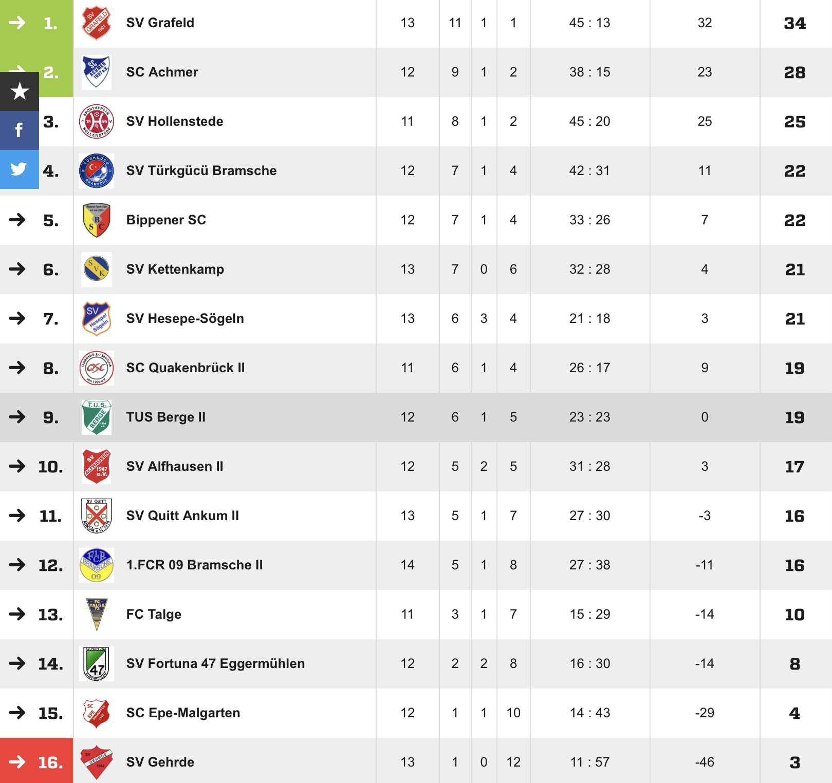 SV Türkgücü Bramsche setzte sich mit diesem Sieg von TUS Berge II ab und belegt nun mit 22 Punkten den vierten Rang, während TUS Berge II weiterhin 19 Zähler auf dem Konto hat und den neunten Tabellenplatz einnimmt.