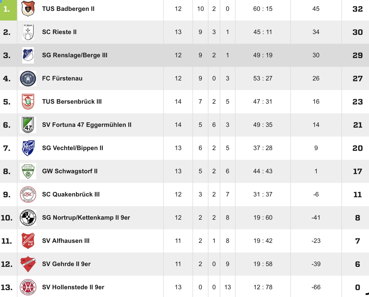 SG Renslage/Berge III hat das nächste Spiel in zwei Wochen, am 10.04.2026 gegen TUS Bersenbrück III. Am 19.04.2026 reist TUS Badbergen II zur nächsten Partie zu FC Fürstenau.