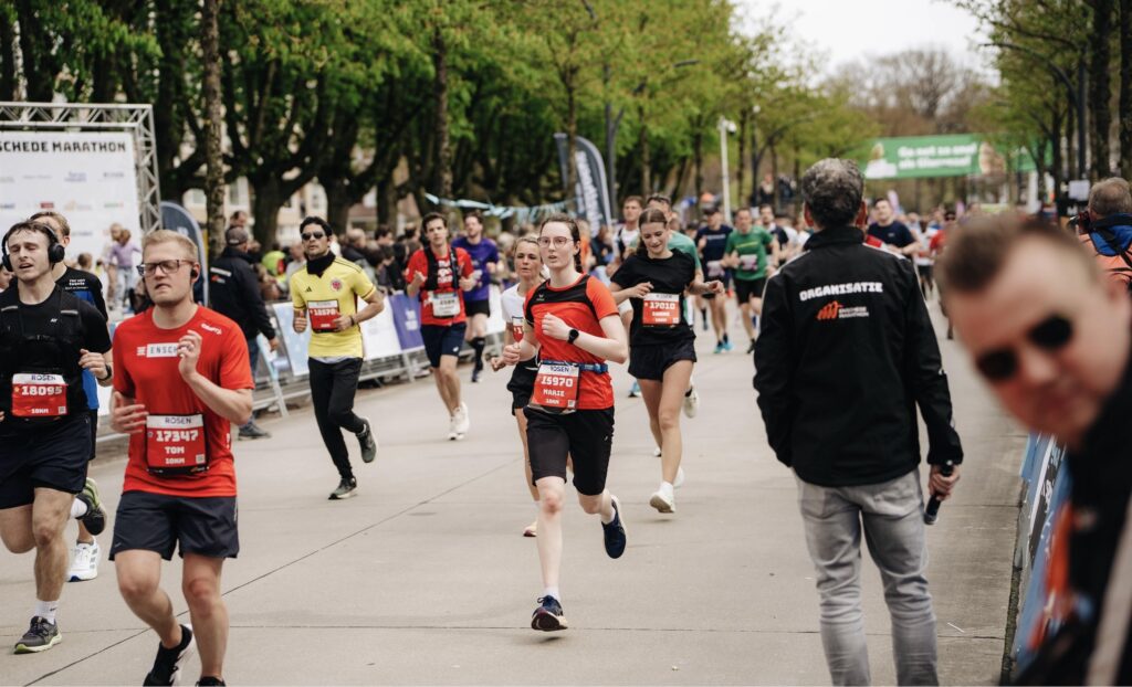Am Sonntag, den 12.04.2026 war es also so weit, um 10 Uhr startete der Marathon in Enschede, also nicht nur, denn es gingen nicht nur über 3000 Marathonis an den Start, sondern auch mehr als doppelt so viele Menschen über die 21km lange Halbmarathon Strecke. Mit unter ihnen auch unsere Cosima, obwohl sie erst im März wieder genügend Motivation gefunden hat, nach einer längeren Pause wieder in das Training einzusteigen. Bei unseren abendlichen Laufrunden kam dann auch bald das Gespräch auf die anstehende Veranstaltung in Enschede, für die die Autorin dieses Berichtes sich, auf Initiative des Gehrder Lauftreffs, bereits im Dezember letzten Jahres angemeldet hat. Da Cosima dieses Event mit der traditionell guten Stimmung – denn das die Niederländer ein Partyvolk sind, ist hier ja allgemein bekannt- bereits kannte, war auch sie schnell Feuer und Flamme.