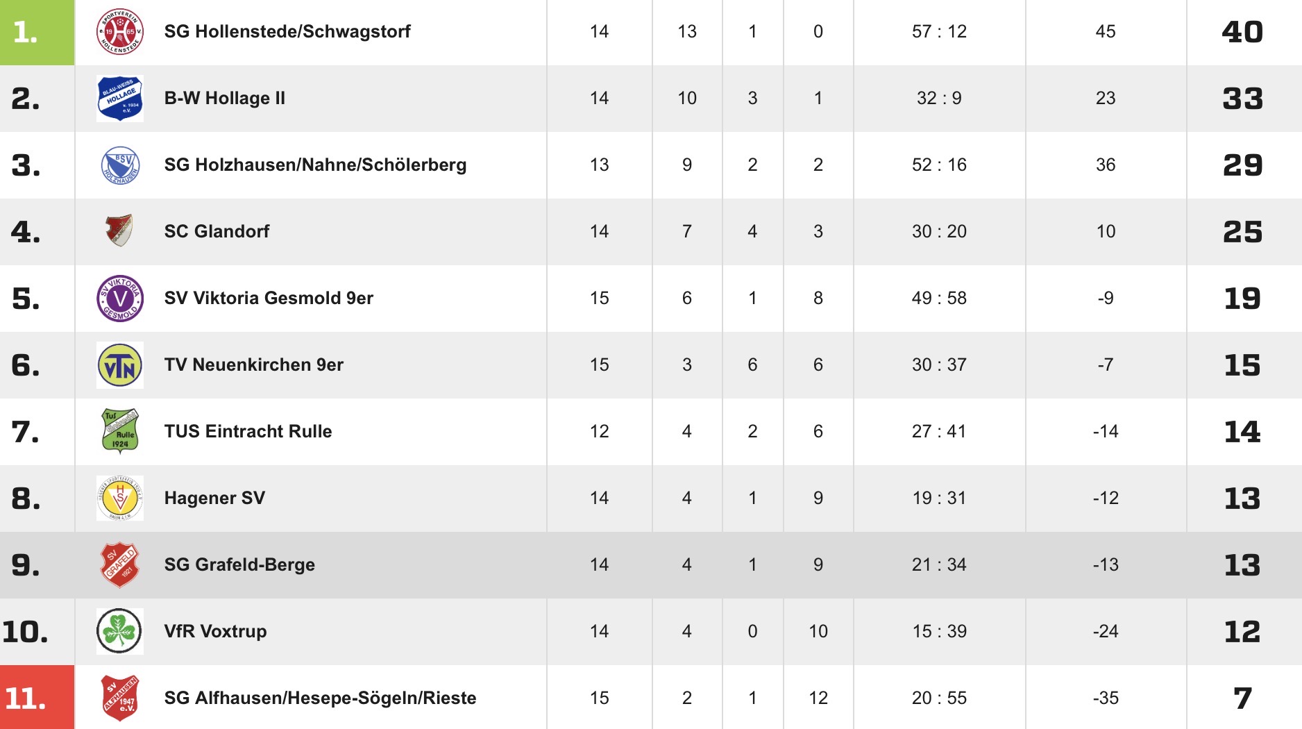 SG Grafeld-Berge ist jetzt mit 13 Zählern punktgleich mit Hagener SV, platziert sich jedoch aufgrund des schlechteren Torverhältnisses von 21:34 auf dem neunten Rang etwas dahinter. Beide Teams fuhren in dieser Saison bisher vier Siege ein.