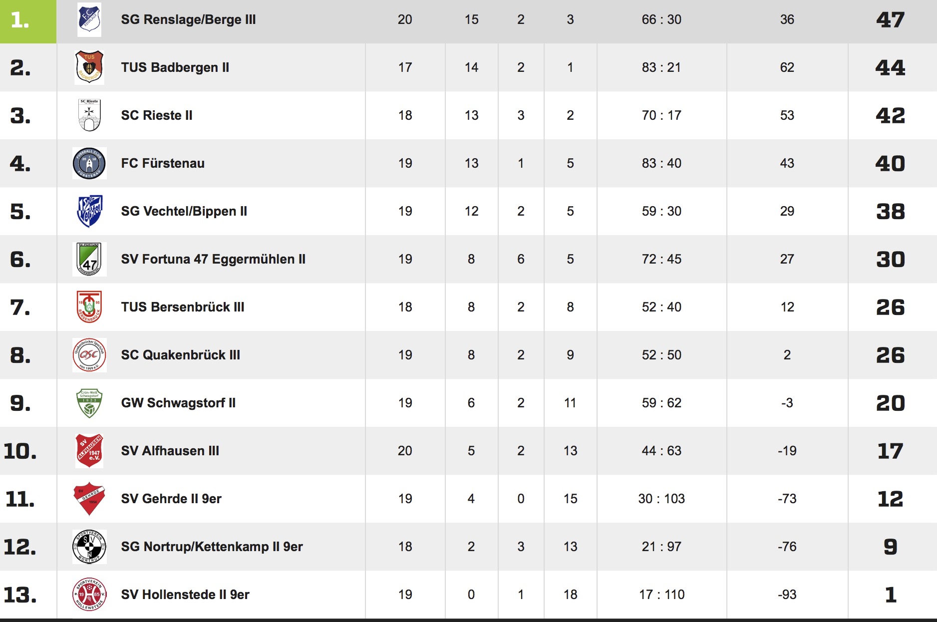 SG Renslage/Berge III wandert mit nun 47 Zählern auf dem Konto weiter auf dem Erfolgspfad, während die Welt von SV Gehrde II 9er gegenwärtig trist aussieht.