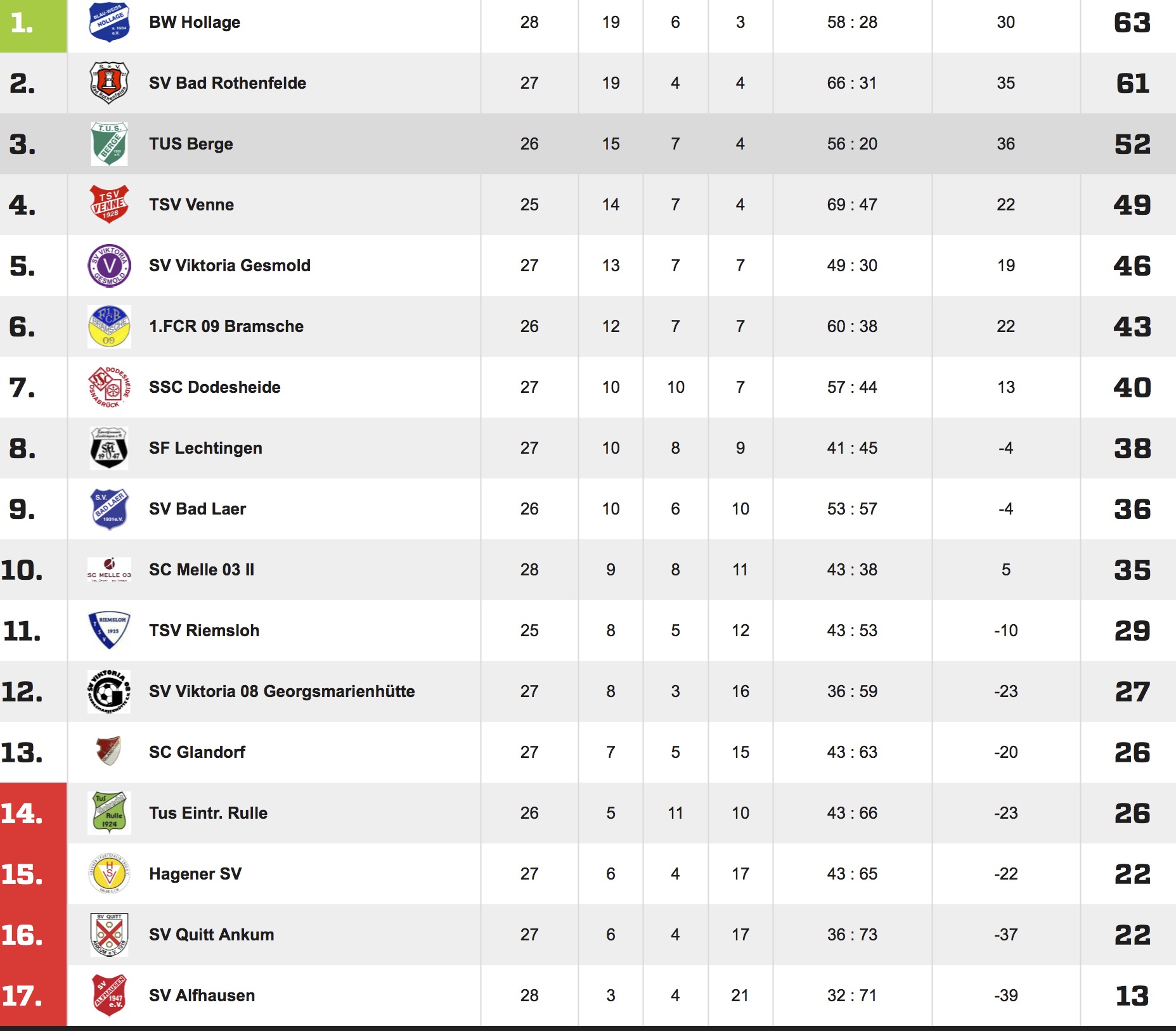 Trotz der drei Zähler machte der TUS Berge im Klassement keinen Boden gut. Bei Team von Rene Wolting greift die alte Fußballweisheit, wonach der Angriff Spiele gewinnt, die Abwehr aber Meisterschaften. Mit gerade einmal 20 Gegentoren stellt der TUS die beste Defensive der Bezirksliga Weser-Ems 5. Der TUS Berge weist in dieser Saison mittlerweile die stolze Bilanz von 15 Erfolgen, sieben Punkteteilungen und vier Niederlagen vor. Nach vier sieglosen Spielen ist der TUS wieder in der Erfolgsspur.